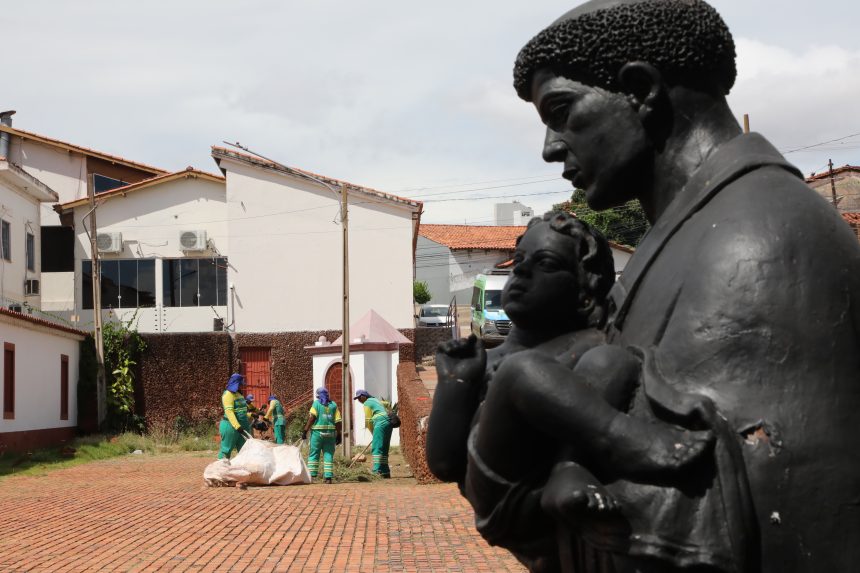A imagem mostra a estátua de São Benedito, com profissionais da Limpurb atuando na limpeza do ponto histórico da capital ao fundo. A foto captura também a Igreja do Rosário e São Benedito.